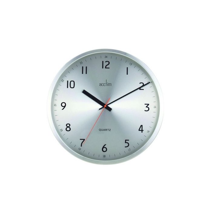 Brushed Aluminium finish metal case and spun metal dial with black hands and a red, non-ticking sweep second hand. Quartz movement. Requires 1 x AA battery, not included. Dimension: 398 x 398 x 50mm