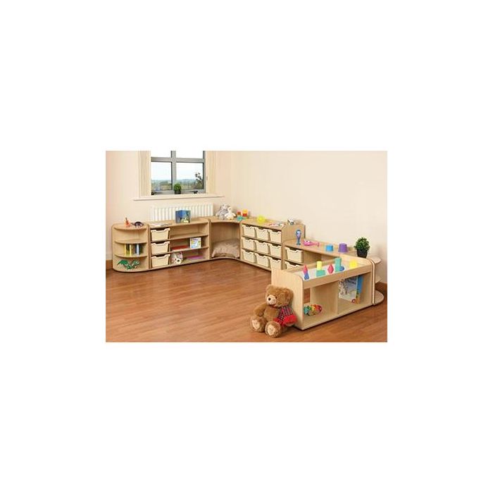This set includes 7 products with plenty of tray and shelf storage as well as our mirror unit and corner unit. Perfect for a classroom or nursery setting. Each item in set connects with joining bolts supplied for extra stability. Supplied flat packed with a 10 year manufacturer's warranty. Room Scene is not supplied with Magnolia trays as shown, it is supplied with Clear Trays.