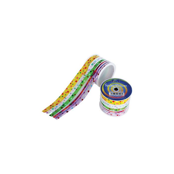 Colourful Spring ribbons in 6 spotted designs ideal for Easter projects and can be used for various textiles projects throughout the year - Colourful ribbons each 4.5m long - Pack