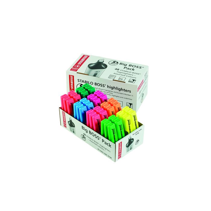 This STABILO BOSS ORIGINAL store pack is the perfect complete box of highlighters to keep in your stationery cupboard. The STABILO BOSS strong build quality and long writing length makes it the number one highlighter choice. The STABILO Anti-Dry-Out Technology promises that the lid can be left off for up to 4 hours without the ink drying out. The robust wedge tip enables broad area highlighting (5mm) as well as fine underlining (2mm). Water based ink and harmless to health. Good for the environment. 8 assorted bright colours - Blue, Green, Lilac, Orange, Pink, Red, Turquoise and Yellow. Pack of 48.