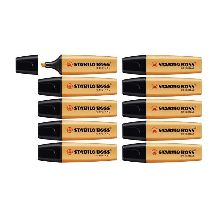 This STABILO BOSS ORIGINAL store pack is the perfect complete box of highlighters to keep in your stationery cupboard. The STABILO BOSS strong build quality and long writing length makes it the number one highlighter choice. The STABILO Anti-Dry-Out Technology promises that the lid can be left off for up to 4 hours without the ink drying out. The robust wedge tip enables broad area highlighting (5mm) as well as fine underlining (2mm). Water based ink and harmless to health. Good for the environment, the BOSS Original highlighter can be easily and conveniently refilled with the BOSS Original Refill. Orange. Pack of 10.