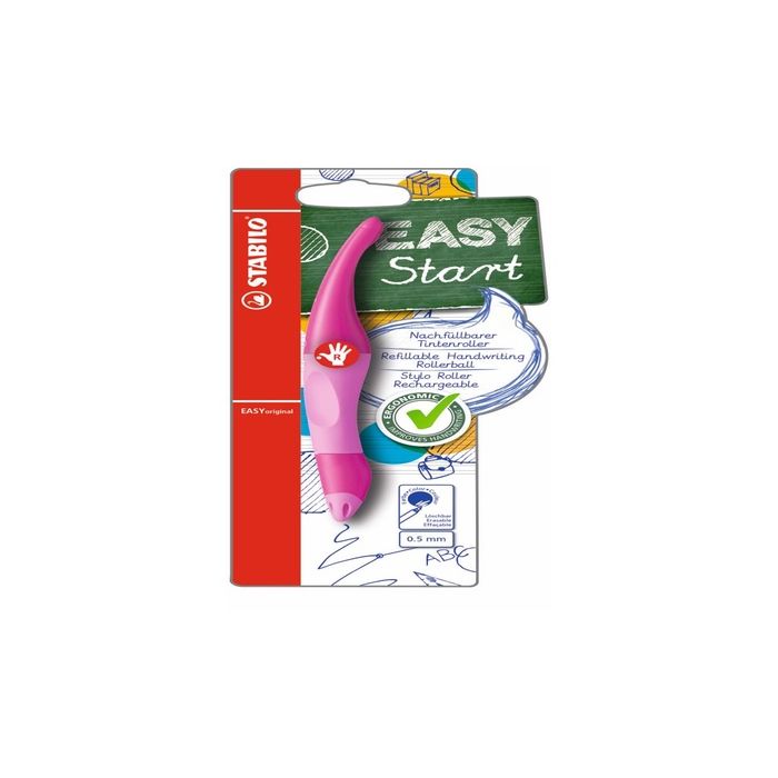 STABILO EASYoriginal ergonomic rollerball pen is a handwriting pen approved by UK teachers which is specially designed for left or right handers and is a must-have for every pencil case. It's ideal for learning to write with, with its moulded grip zone and slightly arched shape it helps young hands learn how to hold the pen correctly. Makes writing relaxed and prevents muscles from tiring so that all school children can really enjoy learning to write without any cramps. The stylish and comfortable rollerball, glides easily over paper and with its sturdy nib means that it will not break or bend under pressure, nor will it get scratchy or blot. Featuring erasable ink. Includes 1 refill per pen. Right Hand. Pink. Pack 5.