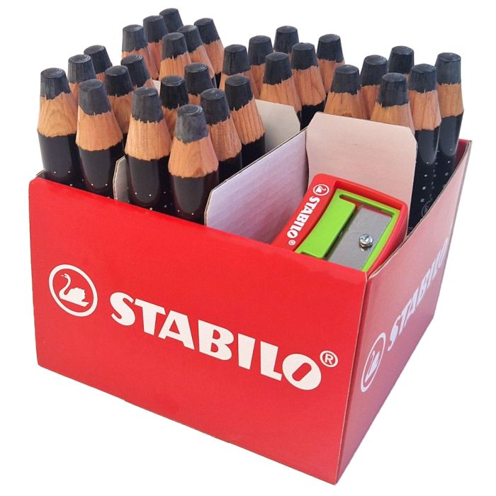 Introducing STABILO MARKdry marker pencil for use on whiteboards, chalkboards, show me boards, glass and flipcharts. A unique and truly sustainable product made from 100% PEFC certified wood and odourless and solvent free lead, which lasts up to five times longer than a liquid whiteboard marker. With constant bright colour output until the last stroke, MARKdry easily erases with a damp or dry cloth on non-porous surfaces and washes off hands and clothes. There’s no cap to lose, it won’t dry out like a standard liquid marker and there’s no bleed through on flip chart paper. Ultra-resistant 10mm XXL Lead. Keep it sharp with our special STABILO sharpener. Ideal for school, office and home use. Pack of 30, class pack includes 30 black marker pencils and 2 sharpeners.