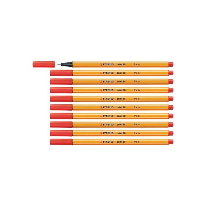 STABILO point 88 is the perfect pen for fine writing, detailed colouring, underlining, marking and mind-mapping in the widest variety of colours. The iconic design and orange and white stripes of STABILO point 88 are recognised around the world as a mark of quality and durability. The hexagonal shaped barrel makes this pen extremely comfortable to hold and the metal enclosed fine fibre tip is strong and durable and perfect for use with rulers and stencils. The 0.4mm line width of point 88 is extremely popular with writers who like a very fine nib and with sketchers, graphic artists and students. Long cap-off time and with fast drying, water based ink. The huge variety of colours make it the perfect choice for intricate colouring, notetaking, mind-mapping and bullet journals and diaries. Red. Pack of 10.
