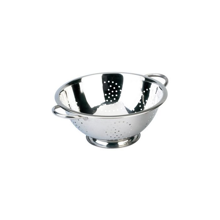 A colander to drain and filter water from food. 30cm in diameter made from stainless steel. Perforated to ensure solids are retained but liquid drains away.