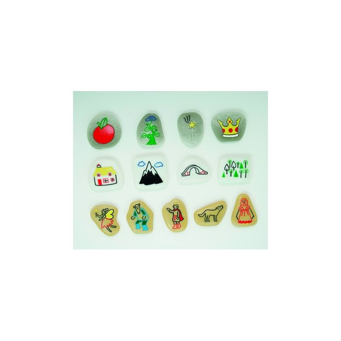 Explore storytelling and structure using this set of illustrated stones. Children can pick a character, setting and object to build fantastic imaginative tales. What did the wolf do in the woods with the wand he stole from the fairy? Why did the princess give the giant an apple when she visited his cottage? Includes 13 stones measuring 50mm. Age2+.