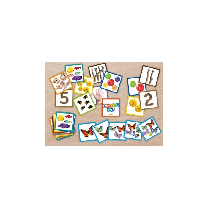 This simple, easy game is a great way to build children's subitizing confidence. As they play their card, they will quickly start to 'see' rather than count, if their card has the same quantity as the previous card. Each quantity to five is shown as digits, random dots, bees, buttons, fingers, flowers, fish, sticks, and seashells. 48 cards in the set, each measuring 98 x 98mm.
