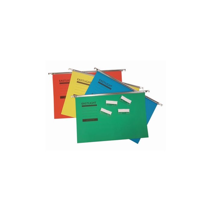 Foolscap manila suspension files. 15mm V Base. Supplied with shields and inserts. Dimensions: 388 x 240mm. Assorted bright colours - 15 of Blue and Green, 10 of Yellow and Red. Pack 50.