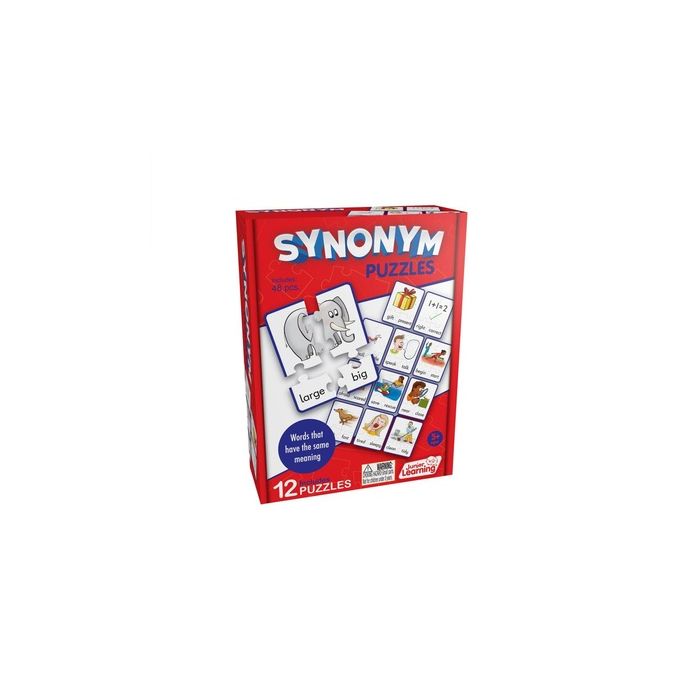Synonyms are words that have the same meaning (such as large and big). Piece together words that have the same meaning with their matching pictures to create a completed puzzle. Contains 48 pieces (12 completed puzzles). Ages 5-8