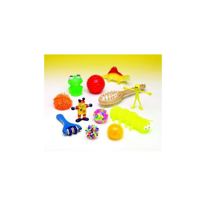 Includes: 1 x bushy ball, 1 x bendy man, 1 x squeezy pop eyed frog, 1 x scrunchy dinosaur, 1 x DNA ball, 1 x knitting ball, 1 x colourful caterpillar, 1 x hedgehog ball, 1 x atomic bead stress ball, 1 x flexi robot, 1 x two wheel massager and 1 x handled massage brush all supplied in a fun kit bag