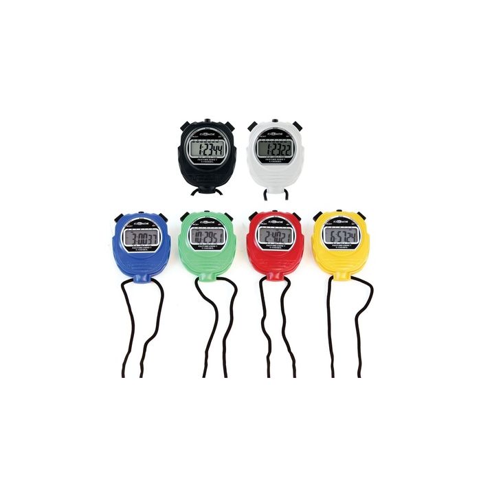 Counts up to 30 minutes in 1/100 seconds and then 24 hours in 1 second intervals. Features a large single digit display and a 3 button layout for easy use. Modes include stopwatch function, time of day and alarm. Supplied complete with neck cord. Size: 7 L x 6cm W. Digit height: 12mm.