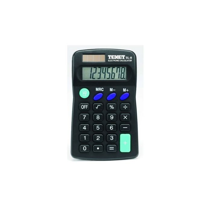 Texet SL8 8 digit pocket calculator. Dual powered. Auto power off. Full function memory. Made from 90% recycled plastic. Includes square root and percentage functions. Hard plastic keys. Suitable for KS1-2. Dimensions - 113 x 64 x 22mm. Each.