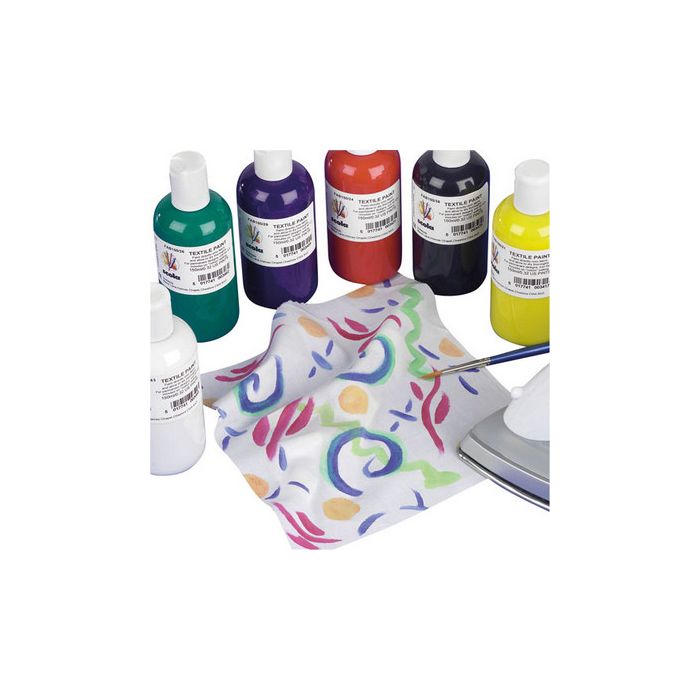 Water-based, intermixable paint. Make permanent by ironing. 1 each of red, yellow, blue, green, black and white. 150ml bottles.