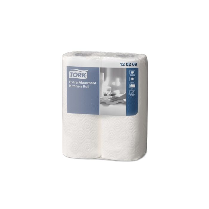 Tork 2 ply. Highly absorbent, 64 sheets per roll, Pack 2. Case 24 rolls
