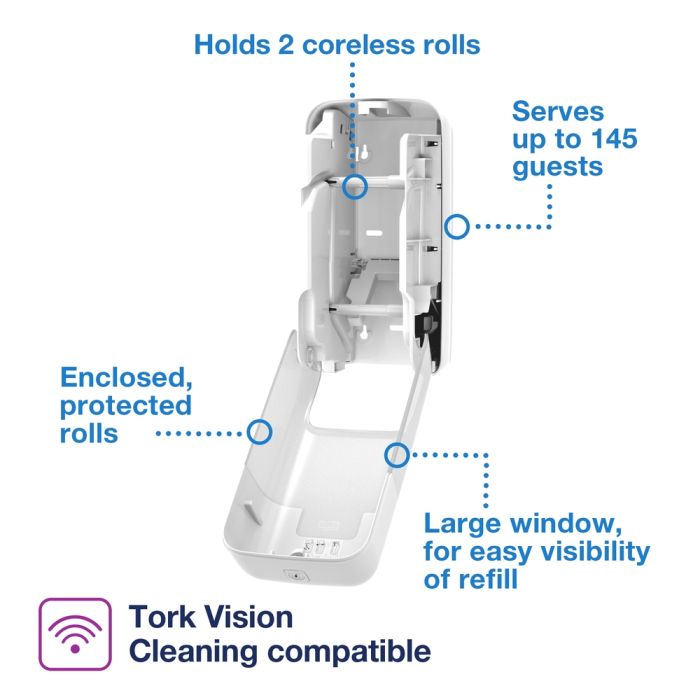 Tork OptiServe® Coreless is a high-capacity toilet paper system for facilities where efficiency, sustainability and providing a great experience are key. Its a better alternative than conventional toilet paper and traditional jumbo rolls. Compared to conventional toilet paper, Tork OptiServe coreless rolls hold three times more paper and have no core and no wrap, creating much less waste. H187 x W335 x L180mm. This product is excluded from all discounts and promotions.