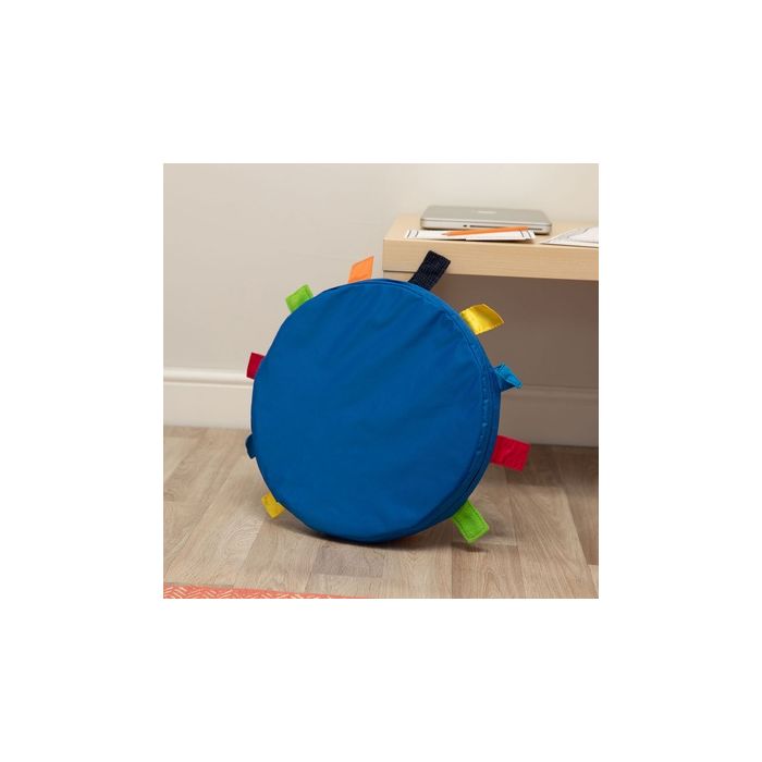 Fringed with colourful tags in six different textures for fidgety fingers to explore. Each Cushion features a handy carry handle. Made from durable waterproof wipe clean polyester fabric for easy maintenance. Suitable for under 3’s. The zip features a concealed zip head cover pocket to help deter children accessing the zip. Complies to UK fire safety regulations BS5852 and has passed all relevant chemical tests. W40 x H5cm.