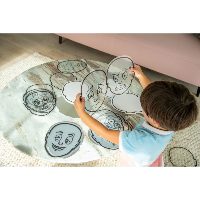 This set includes; 13 acetate faces with varying expressions. Place on a table, window or light panel. A3 expressions poster provides a key, 3 blank white face shaped boards for use with wipe-off markers, 3 blank acetate faces, 3 face shaped mirrors to observe self-expression and a teachers guide.