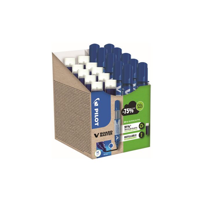This pack features Pilot's V Board Master medium bullet tip markers and their cartridges. The V Board Marker is a high quality bullet tip marker which is made from 91% recycled plastic. Features include vivid colour, smooth flowing ink which can be easily erased from all types of whiteboard surfaces by using a cloth. The twin pipe feeder design enables a constant flow of ink to the cotton tip, so your writing remains sharp and legible, even from a distance. The V Board Master markers have a long lasting ink supply, which can be monitored through the transparent ink cartridge and refilled when necessary. Containing no xylene or similar solvents, it is also refillable. Tip size is 6mm giving a line width of 2.3mm.
