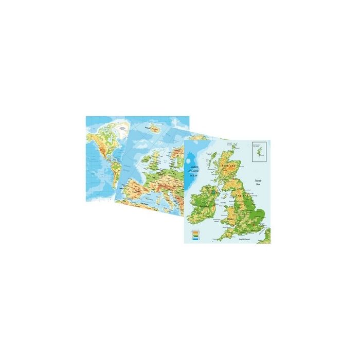 A set of 3 physical map, British Isles, Europe and the World also showing counties, capitals, major towns etc. Printed on durable vinyl with a PVC coating. These versatile maps can be written on with a good quality water-based marker pens and simply wiped clean. Maps have eyelets so they can easily be hung on a wall. Each map is 120 x 90cm