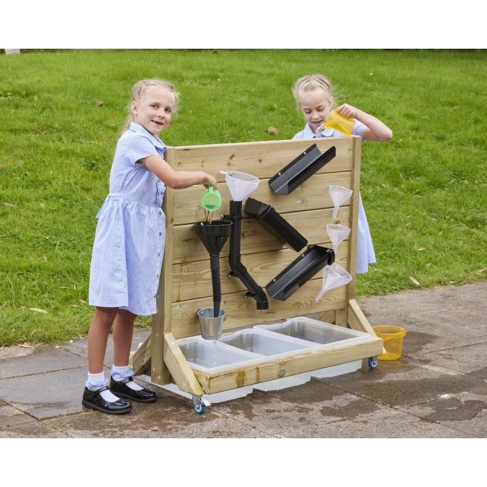 Encourage children to explore water flow with moveable channels, bends and chutes. encourage children to explore water flow with moveable channels, bends and chutes. Double sided with fixed channels on one and the other side allows children to adapts to water flow, but moving the channels and changing the direction of water. All parts are included including 3 trays. Supplied fully assembled. L1060 x D480 x H900mm.