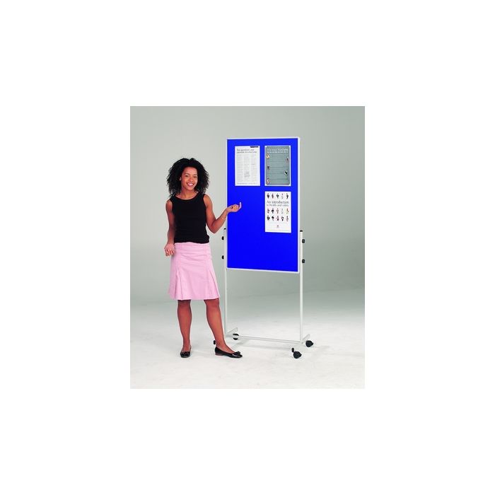 3 practical boards in one - Noticeboard - Whiteboard - Flipchart Easel. Double sided freestanding noticeboards with magnetic whiteboard on one side and blue felt covered pin board on the other. Universal A1 flipchart clamp fits onto magnetic whiteboard. H1200 x W700mm.