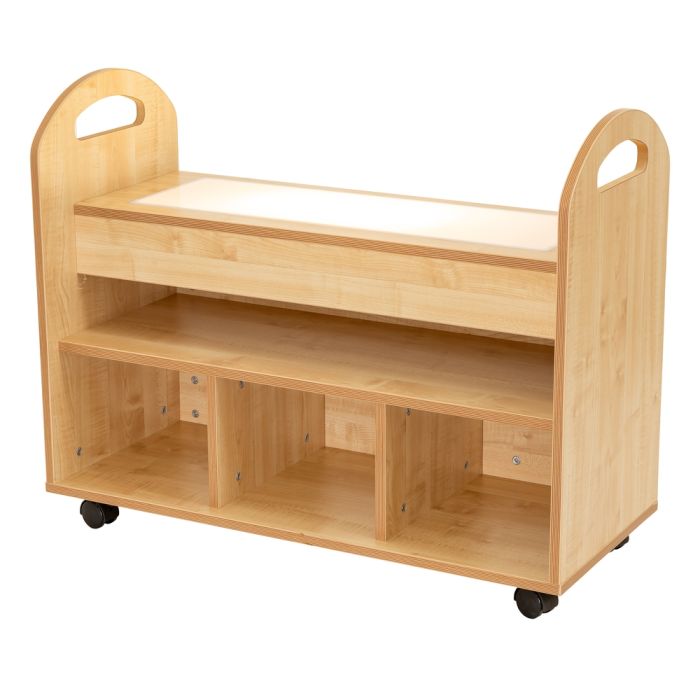 A light up panel in the top of this Wild Wood Investigation Station unit can create opportunities for colour, nature and small world investigation. Underneath the light up panel is a single wide shelf and 3 smaller compartments for storage of useful items for use on the top. Comes with lockable wheels. Suitable for children aged 2+ years. Constructed from 18mm MDF Core with a Maple finish. Delivered Fully Assembled. This product comes with a 5 years manufacturer's guarantee. H750xW940xD400mm *Please note this product requires 4 x AAA batteries (not supplied), the panel at the back of the unit can be removed to access the battery pack to insert batteries.