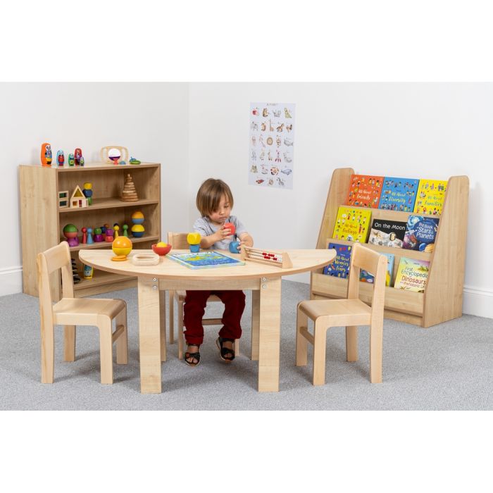 This beautiful semi-circular wooden table is part of the KCS Wild Wood furniture range. Can sit up to 5 children and features a unique leg shape. Supplied fully assembled and is made from an 18mm Maple Effect MDF Core. Hard wearing and made to last. W1630 x D560 x H460mm.