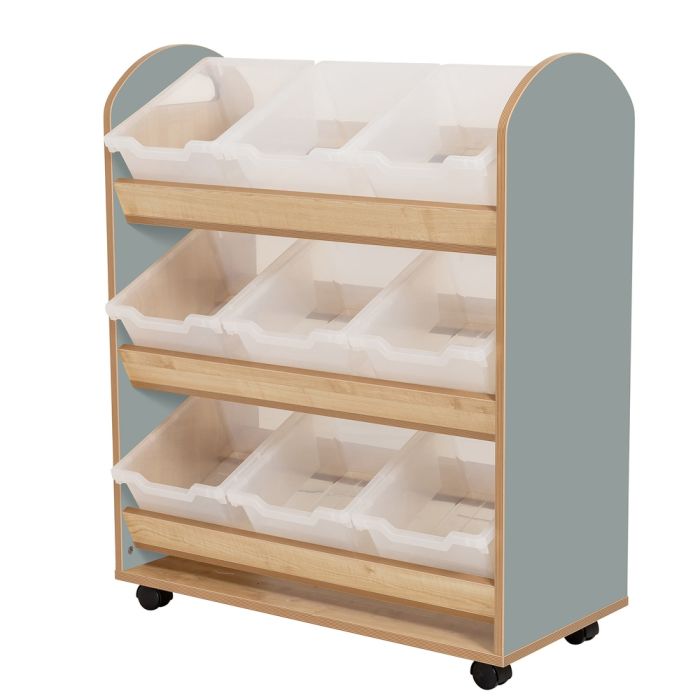 The fantastic Wild Wood Tote storage Trolley in Fjord Green is the most hardworking storage in the setting. Holding 9 clear tubs on 3 shelves, its angled style allows easy access for items. It is super easy to move on its lockable wheels. Features beautifully curved corners that can fit into any environment. Comes with lockable castors and 9 clear tubs. Wipe clean with a damp cloth. Supplied fully assembled with a 5 year manufacturer's warranty. Made from an 18mm Maple and Fjord Green effect MDF wood. H1020xW830xD400mm. Tub dimensions H153xW260xD310mm.