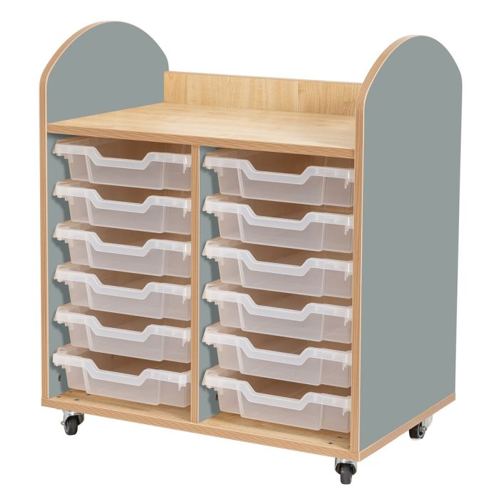 Part of the KCS Wild Wood furniture range, this premium storage unit is supplied with 12 shallow clear Gratnells trays to suit all your storage needs. Features beautifully curved corners that can fit into any environment. Supplied on lockable castors to be able to move around easily and lock into place when not in use. Supplied fully assembled. Made from an 18mm maple effect MDF wood. H830 x W710 x D466mm.