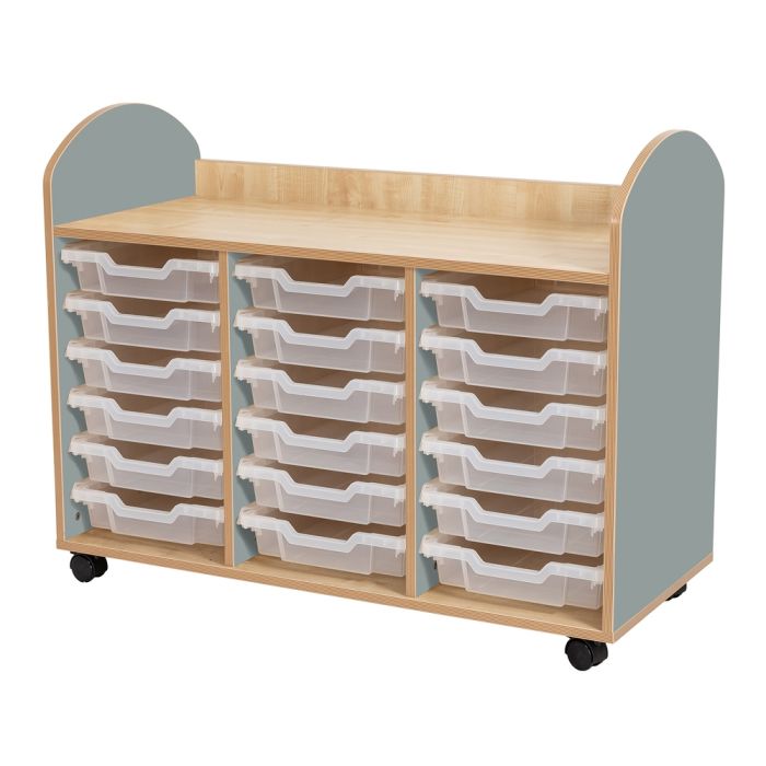 Part of the KCS Wild Wood furniture range, this premium storage unit is supplied with 18 shallow clear Gratnells trays to suit all your storage needs. Features beautifully curved corners that can fit into any environment. Supplied on lockable castors to be able to move around easily and lock into place when not in use. Supplied fully assembled. Made from an 18mm fjord green effect MDF wood. H830 x W1054 x D466mm.