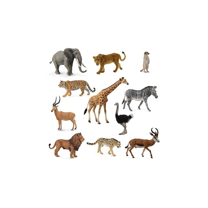 High-quality range of wild animals with realisitc fine-detailing. Includes an elephant, springbok, giraffe, meerkat, zebra, cheetah, ostrich, lion, lioness and tiger. Set of 10. Giraffe measures: 36 x 165 x 155mm. Age 3 years+