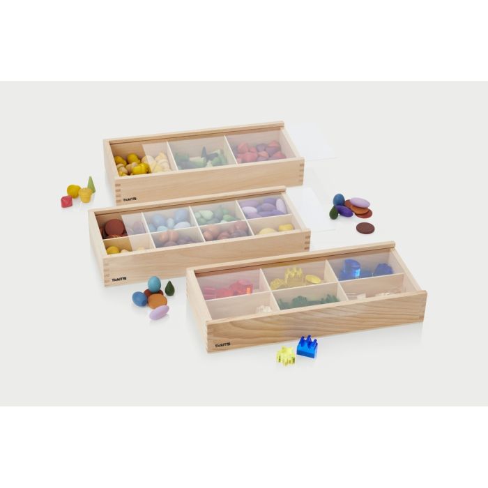 Three beautifully constructed beechwood trays with clear acrylic sliding lids. The trays are divided into 3, 6 and 8 sections which can be used for sorting, displaying or organising natural resources counters or tokens by colour or shape. Size: 375 x 160 x 63mm. Pack of 3.