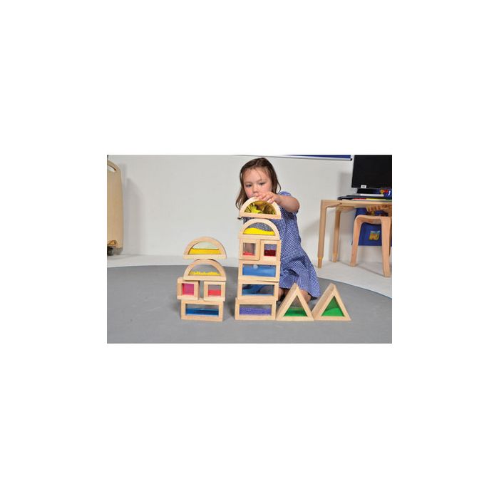 This multi-award winning Sensory Block Set consists of 16 large rubberwood blocks containing beads, transparent acrylic, coloured sand and water/glitter filled pockets in 4 different shapes (square, rectangle, triangle and semicircle). The Sensory Blocks will promote observation in the wider sense, as all the shapes follow the same convention of colour and shape. So for example, regardless of the contents of the block the triangles are always green. The combination of smooth wood exterior and the brightly coloured sensory centre makes a fascinating component with a multitude of educational possibilities for use with children of all ages. Size of rectangle: 140 x 70 x 30mm. Suitable from 12 months.