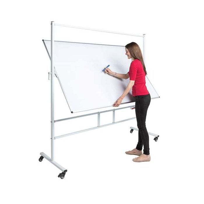 Double sided whiteboard that can pivot on its horizontal axis. Enables both sides to be used, or the surface angled towards the audience. Available with coated steel writing surface that has the advantage of accepting magnets, or non-magnetic surface that is one side plain, one side gridded. Sturdy steel frame has four castors two of which are locking. Steel cross bars aid rigidity and house the supplied pen tray. Optional flip pad clips.