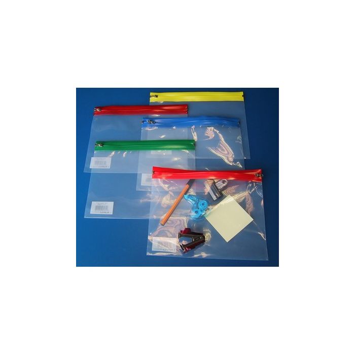 Clear polythene wallets made from strong recyclable plastic. Ideal for securing paperwork, stationery and other small items. Keep everything together whilst protecting from dust, dirt as well as wear and tear. Wipe clean. Color coded zip with brass style fittings for added strength. A5 - 255 x 180mm. Green. Pack of 25.